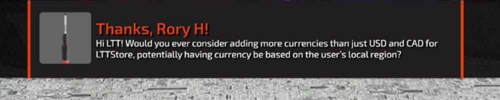 Hi LTT! Would you ever consider adding more currencies than just USD and CAD for LTTStore, potentially having currency be based on the user's local region?