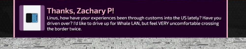 Linus, how have your experiences been through customs into the US lately? Have you driven over? I'd like to drive up for Whale LAN, but feel VERY uncomfortable crossing the border twice.