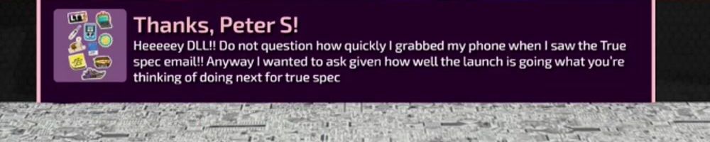Heeeeey DLL!! Do not question how quickly I grabbed my phone when I saw the True spec email!! Anyway I wanted to ask given how well the launch is going what you're thinking of doing next for true spec