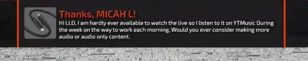 Hi LLD, I am hardly ever available to watch the live so | listen to it on YTMusic During the week on the way to work each morning, Would you ever consider making more audio or audio only content.