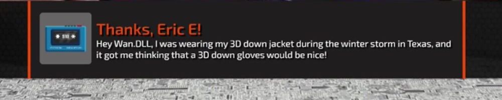 Hey Wan.DLL, I was wearing my 3D down jacket during the winter storm in Texas, and it got me thinking that a 3D down gloves would be nice!