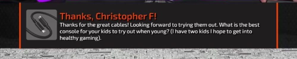 Thanks for the great cables! Looking forward to trying them out. What is the best console for your kids to try out when young? (I have two kids I hope to get into healthy gaming).