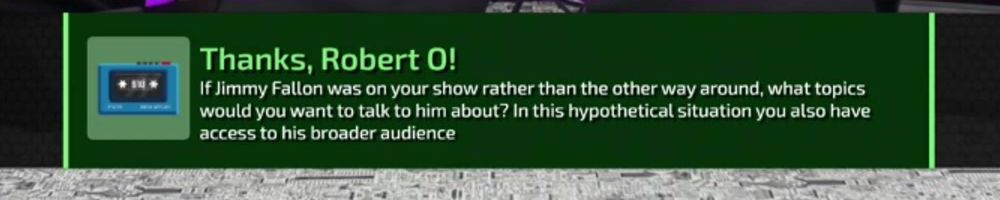 If Jimmy Fallon was on your show rather than the other way around, what topics would you want to talk to him about? In this hypothetical situation you also have access to his broader audience