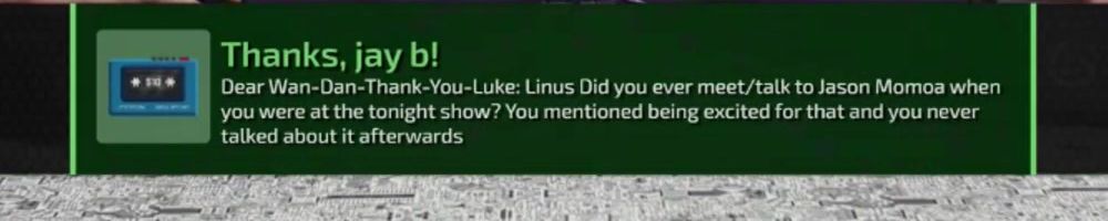 Dear Wan-Dan-Thank-You-Luke: Linus Did you ever meet/talk to Jason Momoa when you were at the tonight show? You mentioned being excited for that and you never talked about it afterwards