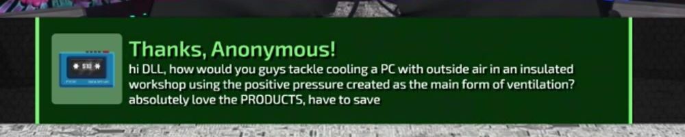 hi DLL, how would you guys tackle cooling a PC with outside air in an insulated workshop using the positive pressure created as the main form of ventilation? absolutely love the PRODUCTS, have to save