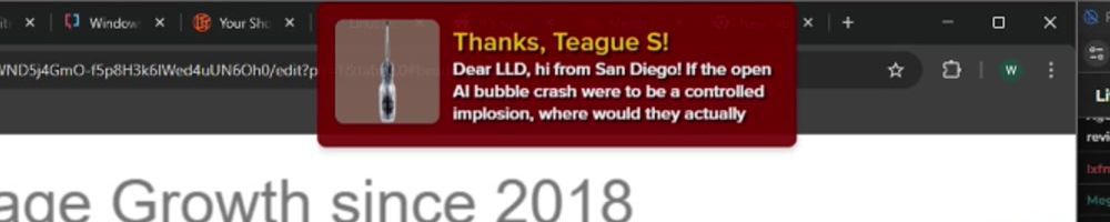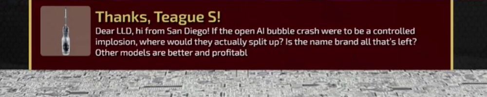 Dear LLD, hi from San Diego! If the open AI bubble crash were to be a controlled implosion, where would they actually split up? Is the name brand all that's left? Other models are better and profitable