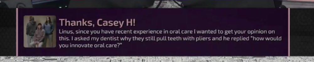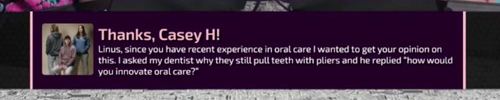 Linus, since you have recent experience in oral care I wanted to get your opinion on this. I asked my dentist why they still pull teeth with pliers and he replied "how would you innovate oral care?"