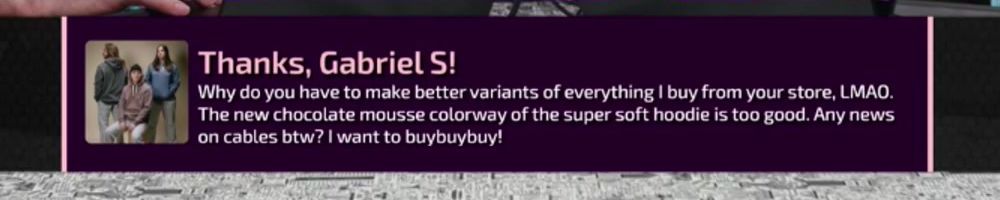 Why do you have to make better variants of everything I buy from your store, LMAO. The new chocolate mousse colorway of the super soft hoodie is too good. Any news on cables btw? I want to buybuybuy!