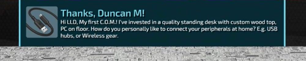 Hi LLD, My first C.O.M.! I've invested in a quality standing desk with custom wood top, PC on floor. How do you personally like to connect your peripherals at home? E.g. USB hubs, or Wireless gear.