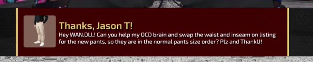 Hey WAN.DLL! Can you help my OCD brain and swap the waist and inseam on listing for the new pants, so they are in the normal pants size order? Plz and ThankU!