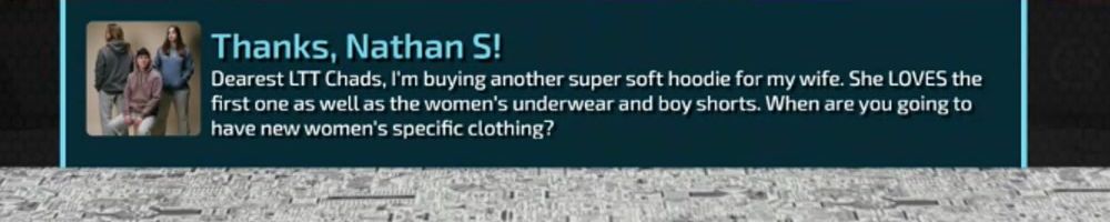 Dearest LTT Chads, I'm buying another super soft hoodie for my wife. She LOVES the first one as well as the women's underwear and boy shorts. When are you going to have new women's specific clothing?