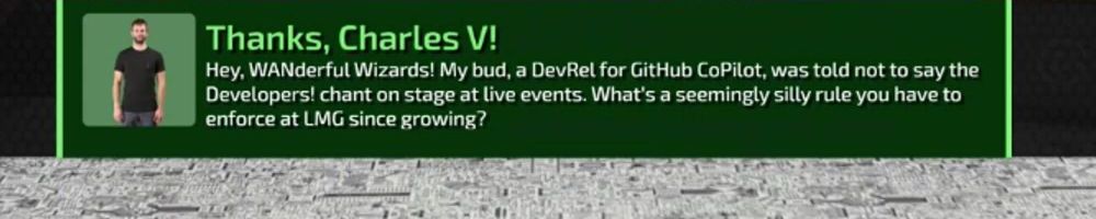 Hey, WANderful Wizards! My bud, a DevRel for GitHub CoPilot, was told not to say the Developers! chant on stage at live events. What's a seemingly silly rule you have to enforce at LMG since growing?