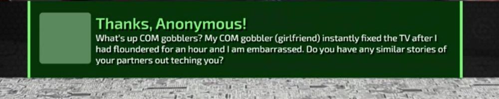 What's up COM gobblers? My COM gobbler (girlfriend) instantly fixed the TV after I had floundered for an hour and I am embarrassed. Do you have any similar stories of your partners out teching you?
