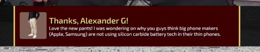 Love the new pants! I was wondering on why you guys think big phone makers (Apple, Samsung) are not using silicon carbide battery tech in their thin phones.
