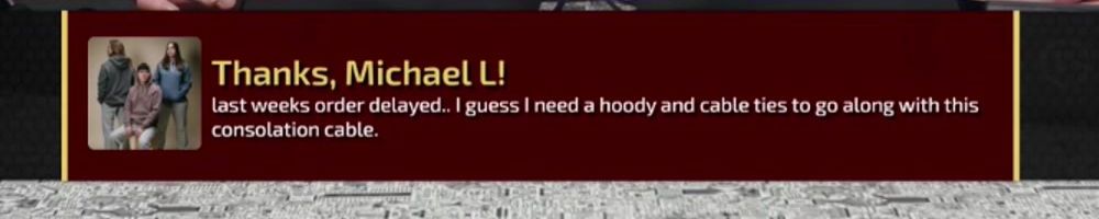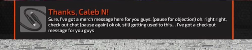 Sure, I've got a merch message here for you guys. (pause for objection) oh, right right, check out chat (pause again) ok ok, still getting used to this... I've got a checkout message for you guys