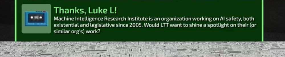 Machine Intelligence Research Institute is an organization working on AI safety, both existential and legislative since 2005. Would LTT want to shine a spotlight on their (or similar org's) work?