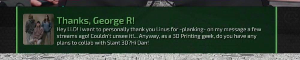 Hey LLD! I want to personally thank you Linus for -planking- on my message a few streams ago! Couldn't unsee it... Anyway, as a 3D Printing geek, do you have any plans to collab with Slant 3D? Hi Dan!