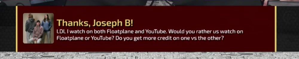 LDL I watch on both Floatplane and YouTube. Would you rather us watch on Floatplane or YouTube? Do you get more credit on one vs the other?