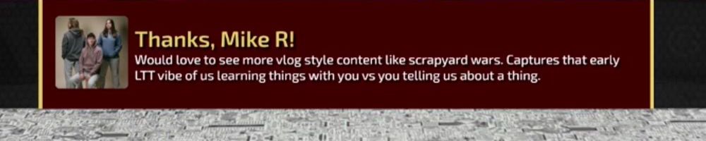 Would love to see more vlog style content like scrapyard wars. Captures that early LTT vibe of us learning things with you vs you telling us about a thing.