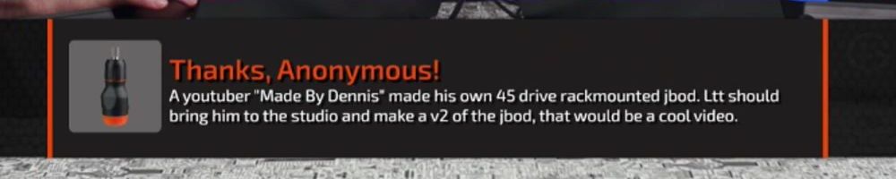 A youtuber "Made By Dennis" made his own 45 drive rackmounted jbod. Ltt should bring him to the studio and make a v2 of the jbod, that would be a cool video.