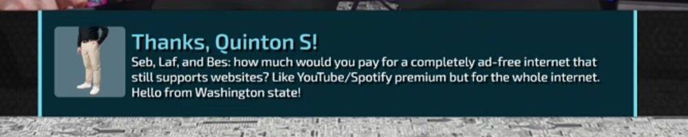 Seb, Laf, and Bes: how much would you pay for a completely ad-free internet that still supports websites? Like YouTube/Spotify premium but for the whole internet. Hello from Washington state!