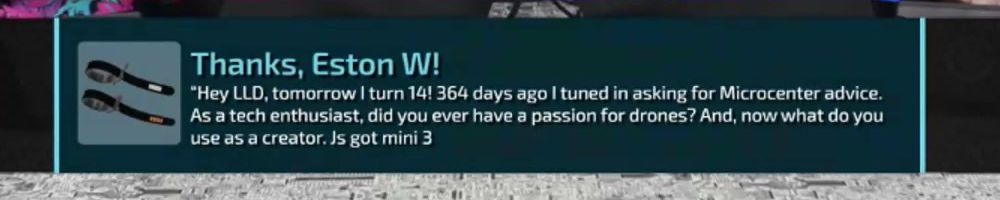 "Hey LLD, tomorrow I turn 14! 364 days ago I tuned in asking for Microcenter advice. As a tech enthusiast, did you ever have a passion for drones? And, now what do you use as a creator. Js got mini 3