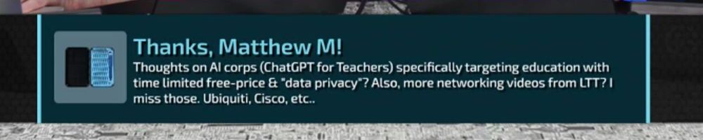 Thoughts on AI corps (ChatGPT for Teachers) specifically targeting education with time limited free-price & "data privacy"? Also, more networking videos from LTT? I miss those. Ubiquiti, Cisco, etc..