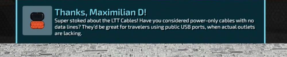 Super stoked about the LTT Cables! Have you considered power-only cables with no data lines? They'd be great for travelers using public USB ports, when actual outlets are lacking.