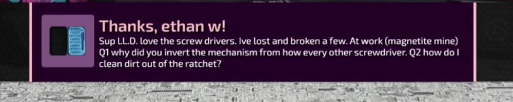 Sup LL.D. love the screw drivers. Ive lost and broken a few. At work (magnetite mine) Q1 why did you invert the mechanism from how every other screwdriver. Q2 how do I clean dirt out of the ratchet?