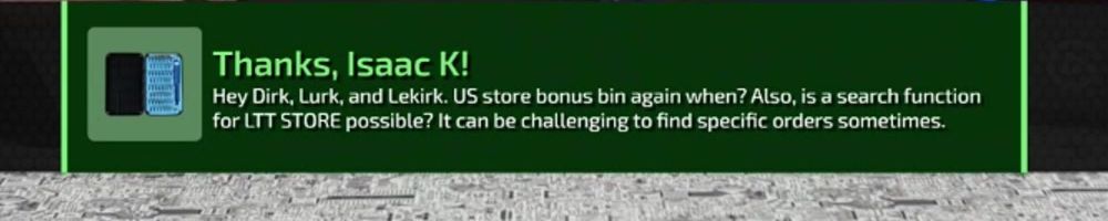 Hey Dirk, Lurk, and Lekirk. US store bonus bin again when? Also, is a search function for LTT STORE possible? It can be challenging to find specific orders sometimes.