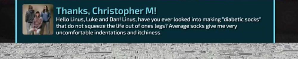 Hello Linus, Luke and Dan! Linus, have you ever looked into making "diabetic socks" that do not squeeze the life out of ones legs? Average socks give me very uncomfortable indentations and itchiness.