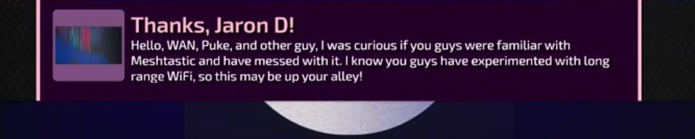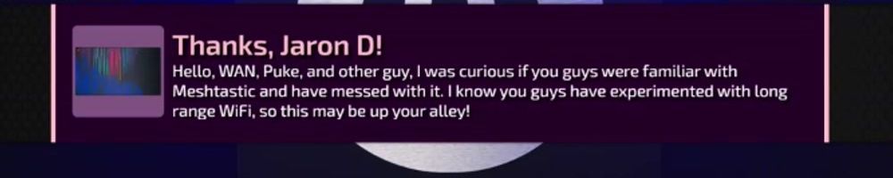 Hello, WAN, Puke, and other guy, I was curious if you guys were familiar with Meshtastic and have messed with it. I know you guys have experimented with long range WiFi, so this may be up your alley!