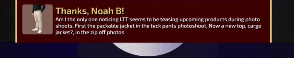 Am I the only one noticing LTT seems to be teasing upcoming products during photo shoots. First the packable jacket in the teck pants photoshoot. Now a new top, cargo jacket?, in the zip off photos