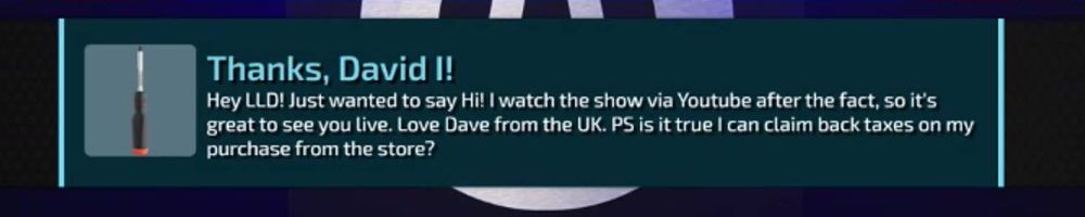 Hey LLD! Just wanted to say Hi! I watch the show via Youtube after the fact, so it's great to see you live. Love Dave from the UK. PS is it true I can claim back taxes on my purchase from the store?