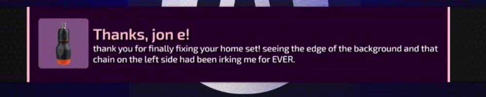 thank you for finally fixing your home set! seeing the edge of the background and that chain on the left side had been irking me for EVER.