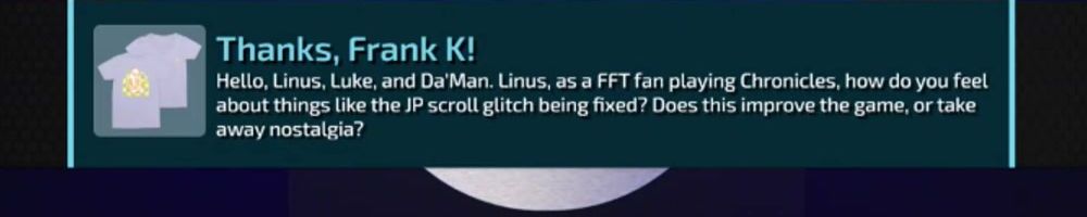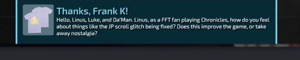 Hello, Linus, Luke, and Da'Man. Linus, as a FFT fan playing Chronicles, how do you feel about things like the JP scroll glitch being fixed? Does this improve the game, or take away nostalgia?