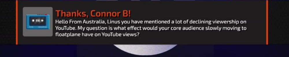 Hello From Australia, Linus you have mentioned a lot of declining viewership on YouTube. My question is what effect would your core audience slowly moving to floatplane have on YouTube views?