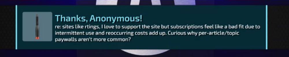 re: sites like rtings, I love to support the site but subscriptions feel like a bad fit due to intermittent use and reoccurring costs add up. Curious why per-article/topic paywalls aren't more common?
