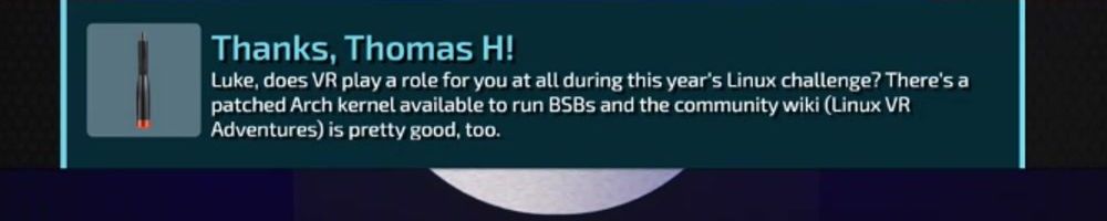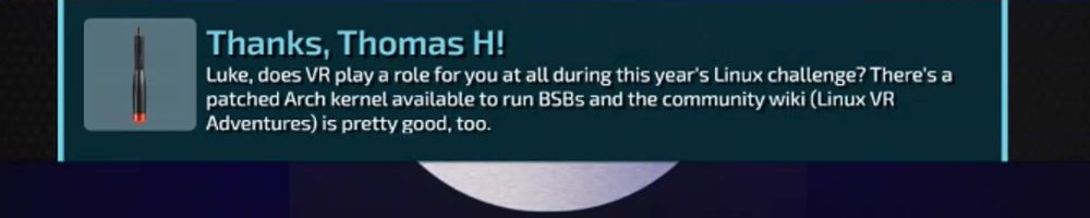 Luke, does VR play a role for you at all during this year's Linux challenge? There's a patched Arch kernel available to run BSBs and the community wiki (Linux VR Adventures) is pretty good, too.