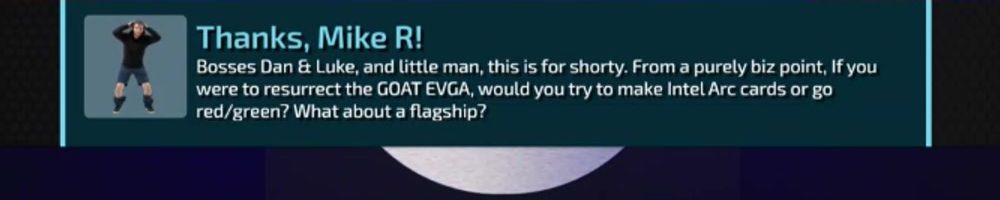 Bosses Dan & Luke, and little man, this is for shorty. From a purely biz point, If you were to resurrect the GOAT EVGA, would you try to make Intel Arc cards or go red/green? What about a flagship?