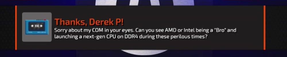 Sorry about my COM in your eyes. Can you see AMD or Intel being a "Bro" and launching a next-gen CPU on DDR4 during these perilous times?