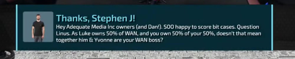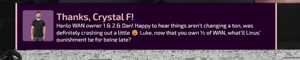 Luke, now that you own ½ of WAN, what'll Linus' | Timestamp |  |