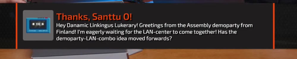 Hey Danamic Linkingus Lukerary! Greetings from the Assembly demoparty from