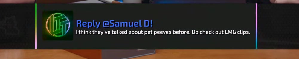 I think they've talked about pet peeves before. Do check out LMG clips. | Timestamp |  |