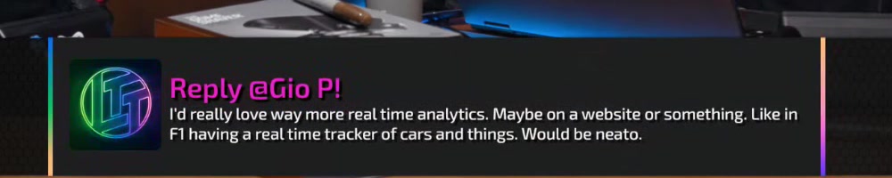 F1 having a real time tracker of cars and things. Would be neato. | Timestamp |  |