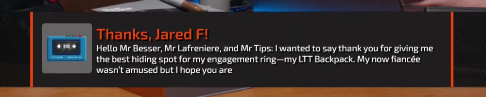 Hey ltt, my husband Chase loves your show and is watching rn. He doesn't know I'm