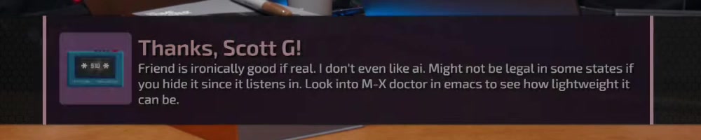 Friend is ironically good if real. I don't even like ai. Might not be legal in some states if