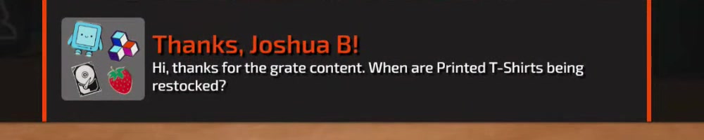 | Joshua G | message | Thanks, Joshua G!