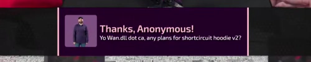 Yo Wan.dll dot ca, any plans for shortcircuit hoodie v2? | Timestamp |  |