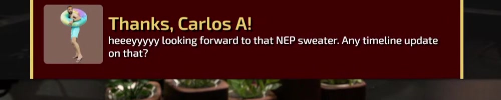 heeeyyyyy looking forward to that NEP sweater. Any timeline update